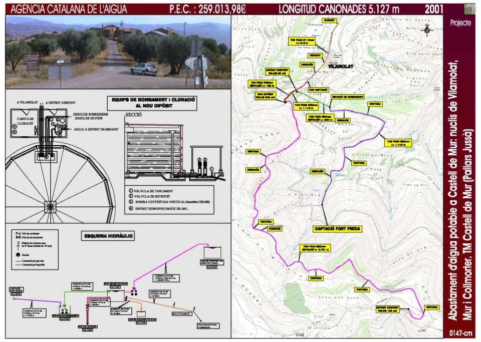 Projecte de la nova captació, portada d'aigua, dipòsit regulador i sistema de bombament a Vilamolat, Mur i Collmorter. TM Castell de Mur (Pallars Jussà).